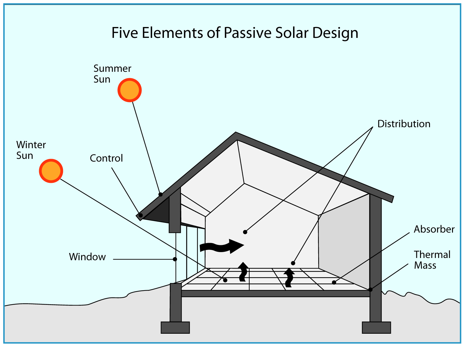 Passive Solar refers to a design strategy by which a house harvests the winter sunlight for heating. Because the sun is much lower in the sky during winter months (solar elevation is 22 degrees in winter but 67 degrees in summer), carefully calculated roof overhangs can allow south facing windows to be exposed to the sun during winter months, yet remain shaded during summer months. A thermal mass (usually in the form of a concrete floor or wall) is used to store the heat from the sunlight, which it then radiates as indoor temperatures begin to cool off at night.