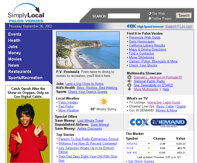 Background - In the Fall of 2001 Cox Communications' cable internet service provider (Excite@Home) was on the verge of bankruptcy. Cox quickly formed Operation Self Reliance, a task force charged with creating an internal ISP (Cox High Speed Internet). Cox Interactive Media's role in this initiative was to build a network of broadband web portals to replace the Excite startpages. I was promoted to the Broadband Content Manager position in October 2001 to lead this effort. The Excite startpages were scheduled to go dark in February of 2002, but this deadline soon shifted to December 2001. My team launched the network on time, and even added several more sites for new Cox markets in early 2002. However, in the third quarter of 2002, Cox announced an internal reorganization of internet operations which effectively halted all further broadband product development for the rest of the year.